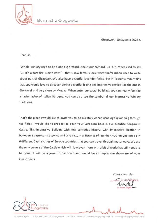 W liście do Muska – w oryginale języku angielskim – możemy przeczytać: „Zwracam się z propozycją ustanowienia Pańską siedzibą w Europie zamku w Głogówku. Ta imponująca rezydencja ma kilkusetletnią historię, doskonałe położenie względem dwóch lotnisk w Katowicach i Wrocławiu, a w odległości do 400 km jest sześć stolic europejskich, do których prowadzą okoliczne autostrady. Jesteśmy jako gmina jedynym właścicielem tego zabytkowego obiektu, który przy pewnych nakładach i pracach byłby prawdziwą perłą naszego miasta i regionu, stanowiąc zarazem godną podziwu wizytówkę Pańskich przedsięwzięć.”