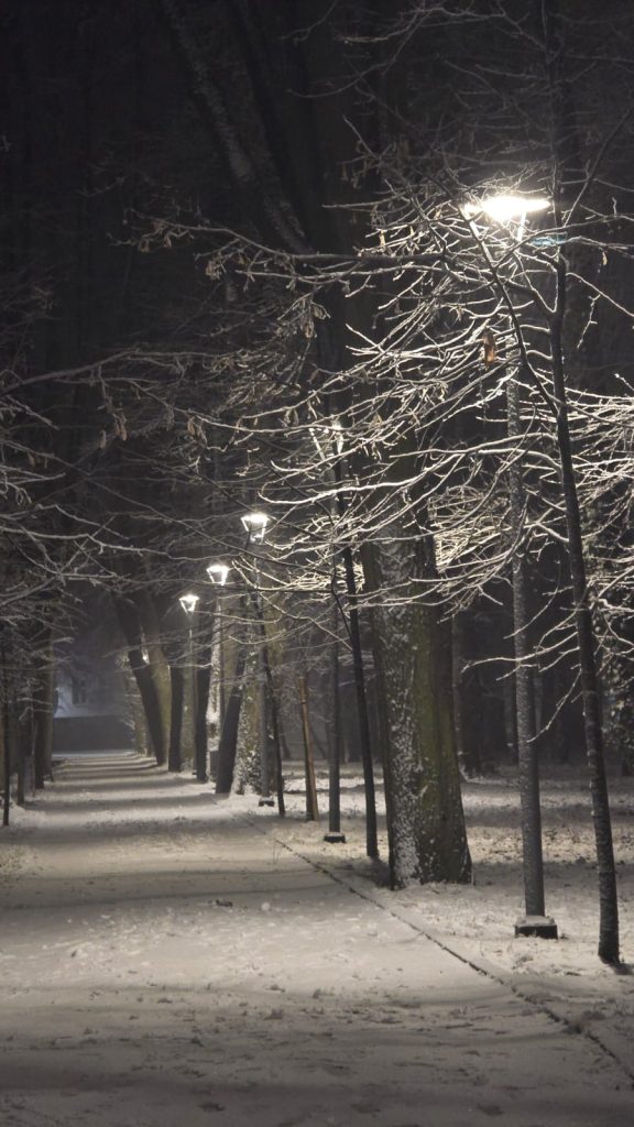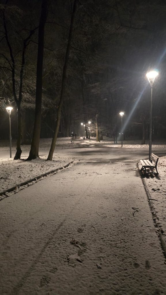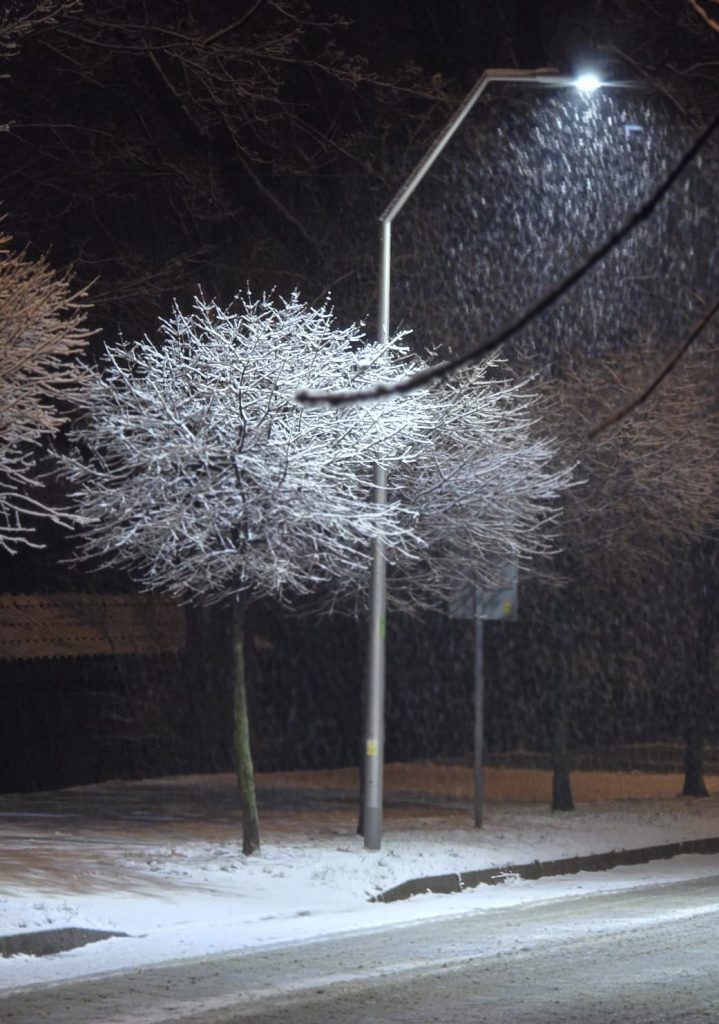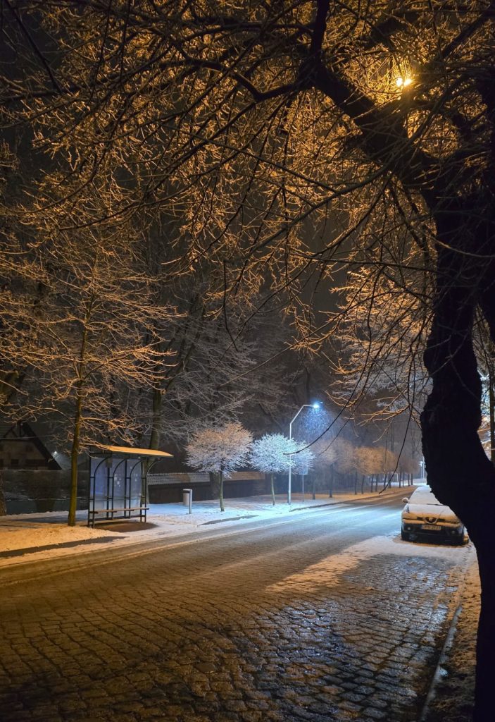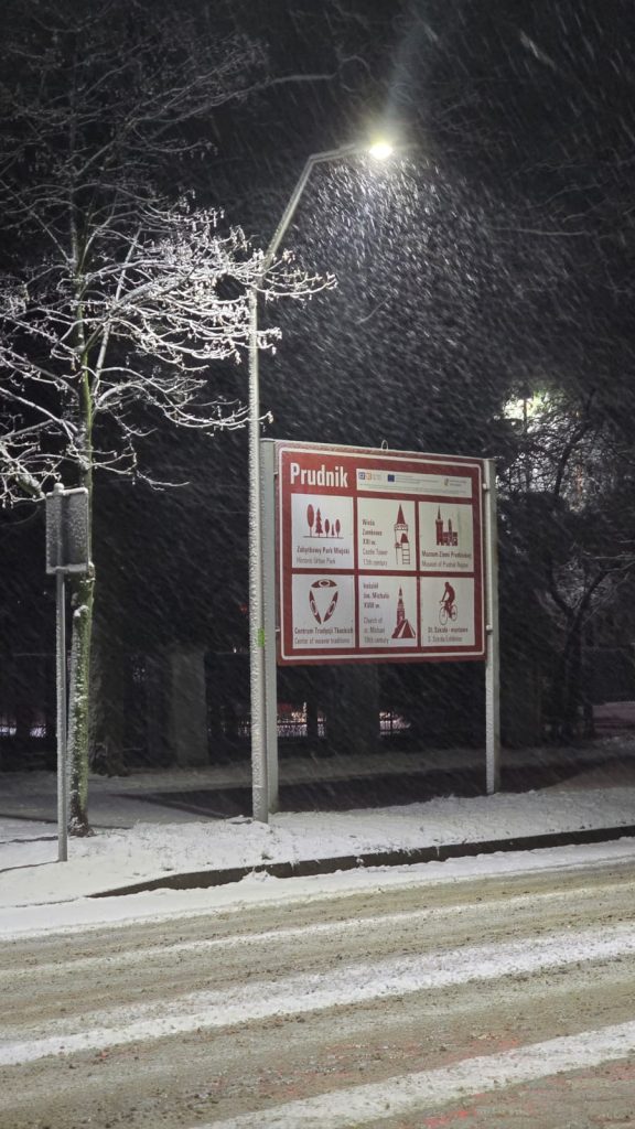 Padający przez część dnia deszcz wieczorem zmienił się w deszcz ze śniegiem, a następnie śnieg. Przynajmniej na kilka godzin ulice, place, skwery i chodniki Prudnika przykryte zostały białym puchem. Pięknie!