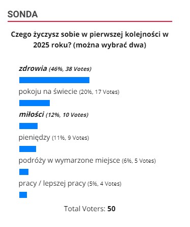 Zapytaliśmy internautów, co sobie życzą w 2025 r., dając możliwość wyboru kilku odpowiedzi (maksymalnie można było wskazać dwie). Blisko połowa głosów (46%) oddana została na zdrowie. Co piąte życzenie dotyczyło pokoju na świecie, co nie dziwi zważywszy na wojnę w Ukrainie, bardzo blisko granic Polski i narastające globalne napięcie w stosunkach międzynarodowych. 12% odpowiedzi dotyczyło miłości, 11% pieniędzy. Pięć głosów oddano na podróż w wymarzone miejsce. Najmniejszym zainteresowaniem, znak naszych czasów, cieszyło się życzenie dotyczące znalezienia pracy lub zmiany pracy na lepszą.
