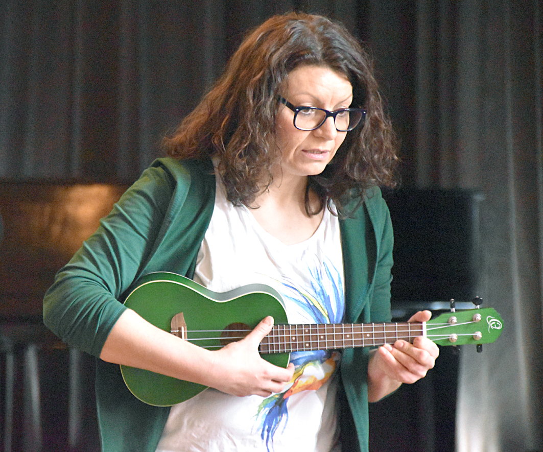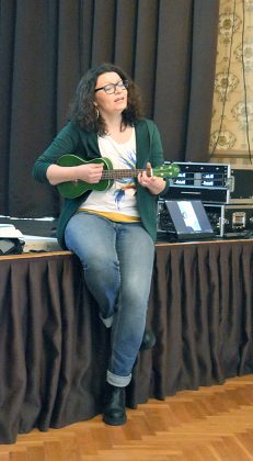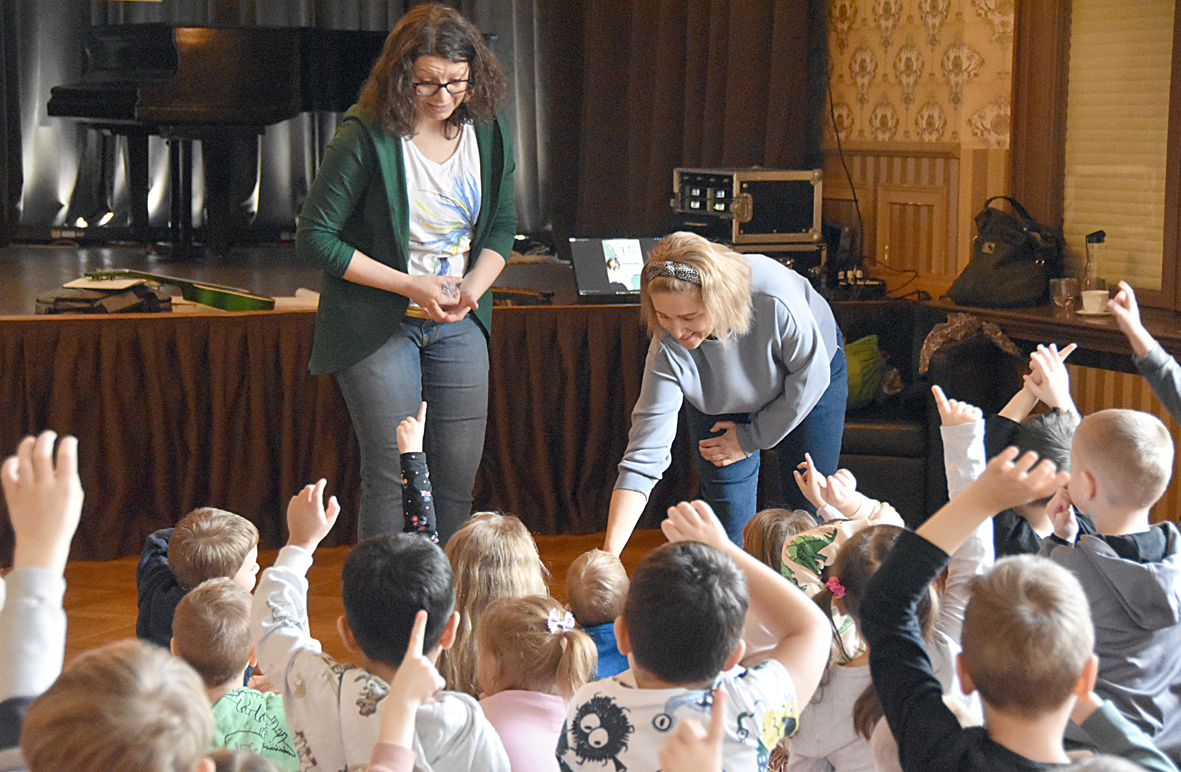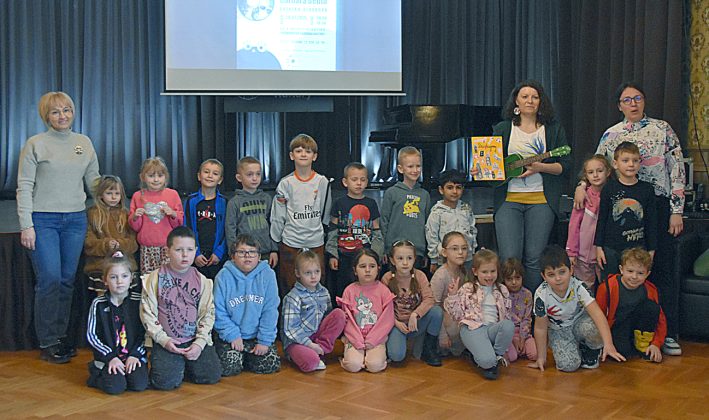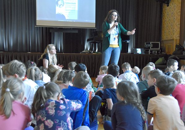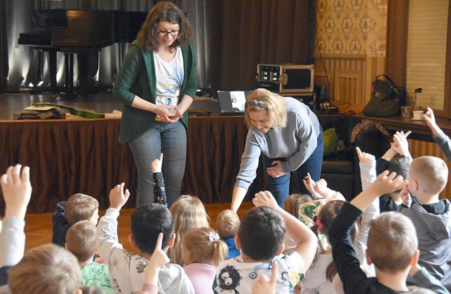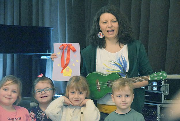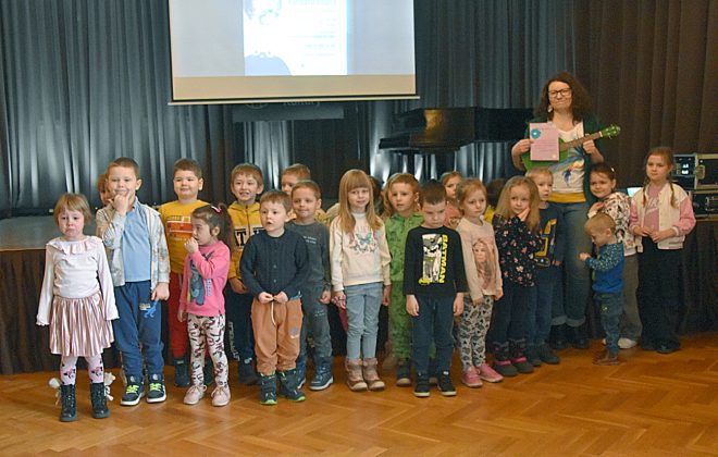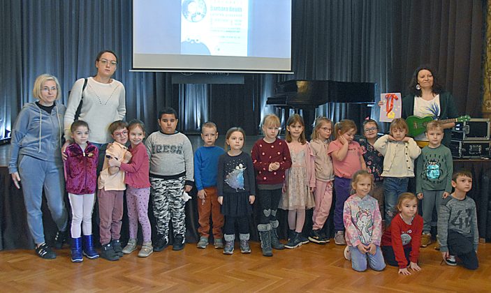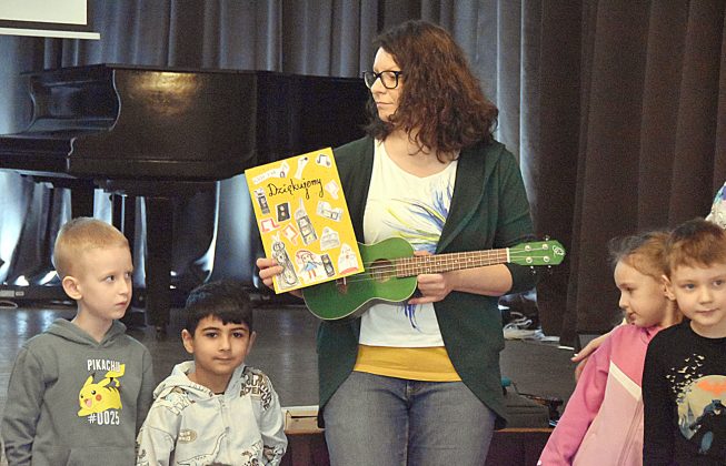 Śpiewać lubi prawie każdy, a przynajmniej posłuchać jak inni ładnie śpiewają, ale skąd się biorą piosenki? Barbara Beuth wyjaśniała jaka jest rola autora piosenek, zarówno w tworzeniu muzyki jak i słów, bo przecież dobra piosenka, to jedno i drugie. A przykładów dobrej piosenki – kompozycji (muzyka i słowa) Barbary Beuth, dzieci mogły posłuchać podczas zajęć. Brzmiało to świetnie i oczarowało słuchaczy. Co więcej autorka akompaniując sobie na ukulele pośpiewała też razem z dziećmi, było więc i praktycznie. Niemniej teorii było nie mało, więc zwyczajowo na koniec były pytania z upominkami.