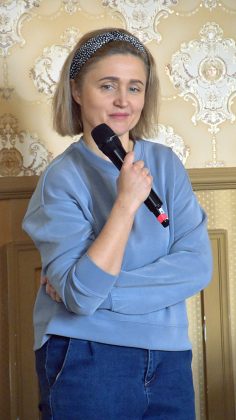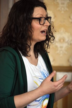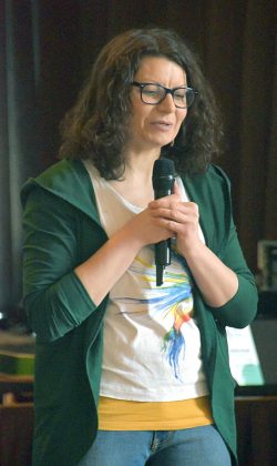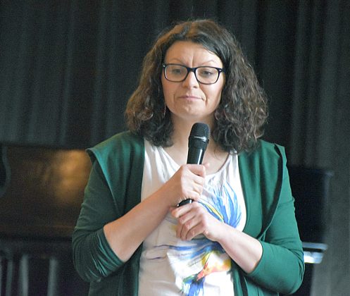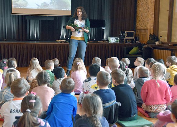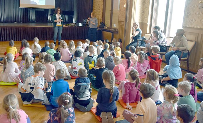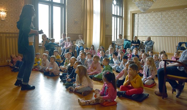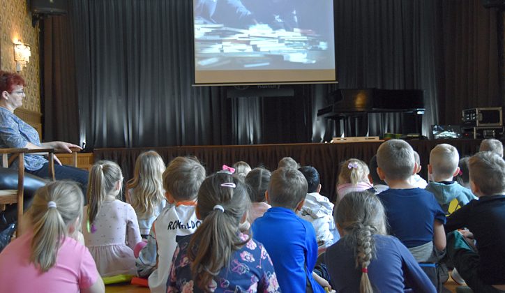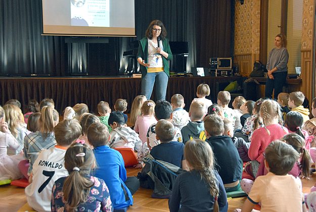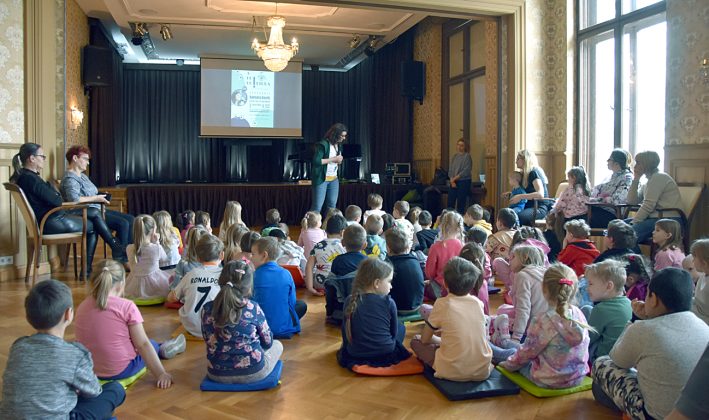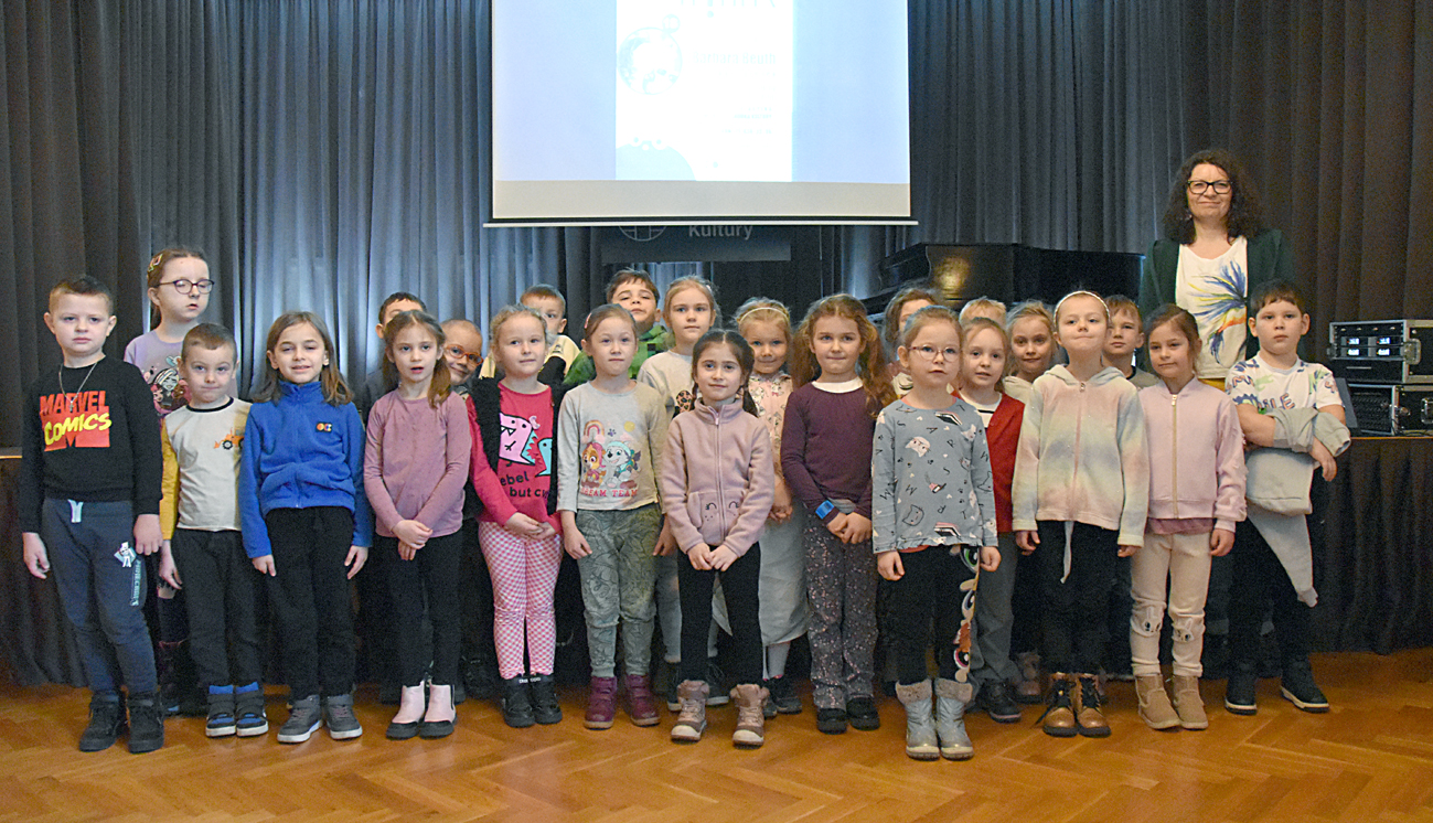Śpiewać lubi prawie każdy, a przynajmniej posłuchać jak inni ładnie śpiewają, ale skąd się biorą piosenki? Barbara Beuth wyjaśniała jaka jest rola autora piosenek, zarówno w tworzeniu muzyki jak i słów, bo przecież dobra piosenka, to jedno i drugie. A przykładów dobrej piosenki – kompozycji (muzyka i słowa) Barbary Beuth, dzieci mogły posłuchać podczas zajęć. Brzmiało to świetnie i oczarowało słuchaczy. Co więcej autorka akompaniując sobie na ukulele pośpiewała też razem z dziećmi, było więc i praktycznie. Niemniej teorii było nie mało, więc zwyczajowo na koniec były pytania z upominkami.