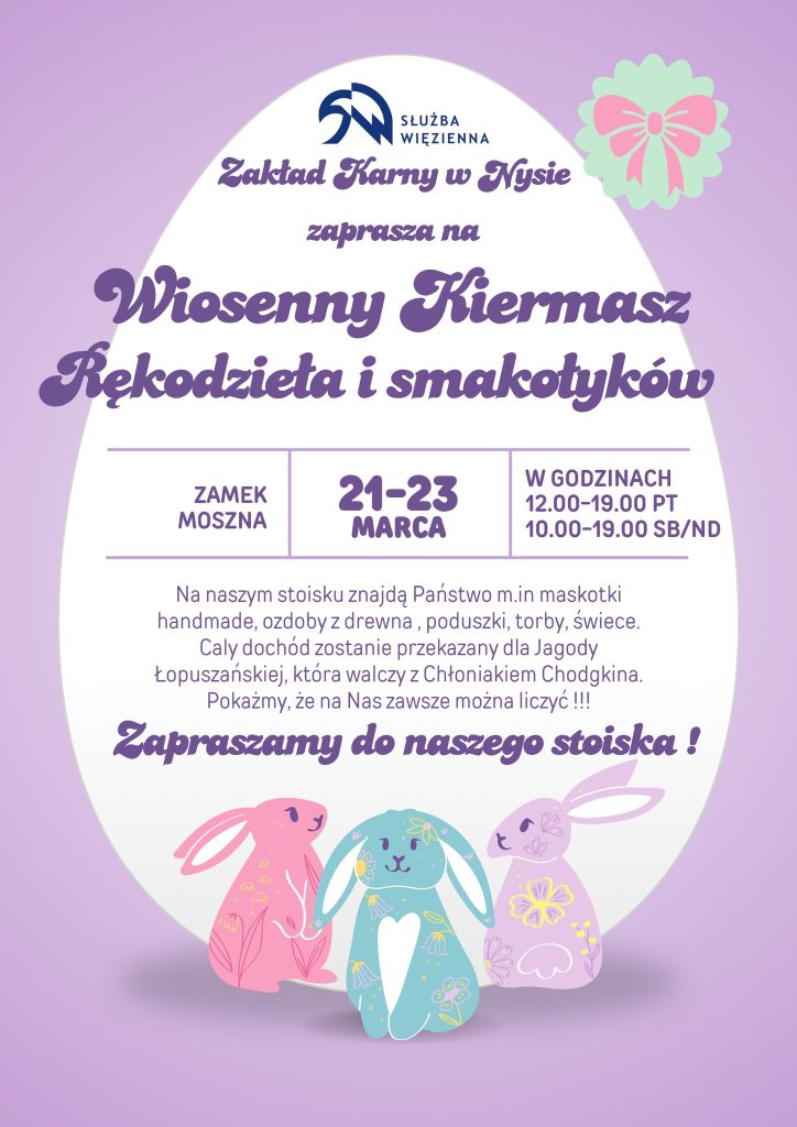 Na Wiosennym Kiermaszu Rękodzieła i Smakołyków w Zamku Moszna będzie można odwiedzić stoisko Zakładu Karnego w Nysie. Datki ze sprzedaży przekazane zostaną na leczenie prudniczanki Jagody Łopuszańskiej.