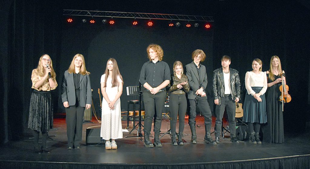 Na zdjęciu grupowym, od lewej: prowadząca wieczór Emilia Kawa (śpiew, gitara), Oliwia Porębska (wiersze), Oliwia Kawa (wiersze, śpiew), Bartek Gąsiorek, Maja Białecka (wokal), Paweł Skoczeń, Tomasz Pusz (gitara), Nikola Iwanecka (wiersze), Małgorzata Kałuża (skrzypce).