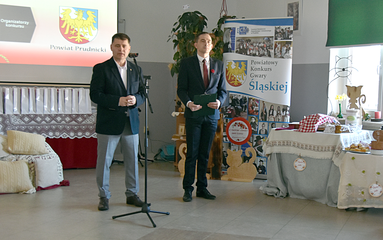Gości podczas konkursu powitali: po dyrektora CKZiU Wojciech Ziarko i starosta prudnicki Radosław Roszkowski. Wśród gości obecni byli m.in.: burmistrz Prudnika Grzegorz Zawiślak i wiceburmistrz Wiesław Kopterski, skarbnik powiatu Larysa Zamorska, regionalistka i kustosz Farskiej Stodoły w Biedrzychowicach Róża Zgorzelska, naczelnik Wydziału Oświaty i Zdrowia Starostwa Powiatowego w Prudniku Anna Wojtczak, przedstawiciel Stowarzyszenia Osób Narodowości Śląskiej Pejter Długosz z Wydawnictwa Silesia Progress, wizytator Małgorzata Makaryk z Kuratorium Oświaty w Opolu, Maria Honka z Radia Doxa w Opolu, współorganizatorka pierwszych konkursów gwary Małgorzata Weigt, twórczyni ludowa Ewa Giemza kierownik Centrum Tradycji Tkackich Muzeum Ziemi Prudnickiej (która podczas konkursu malowała porcelanę w śląskie wzory.