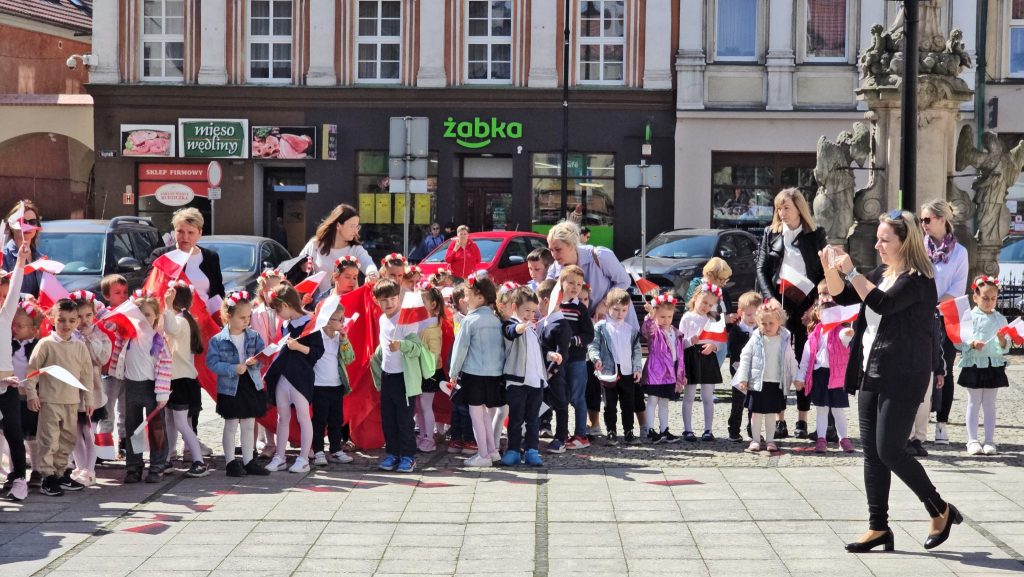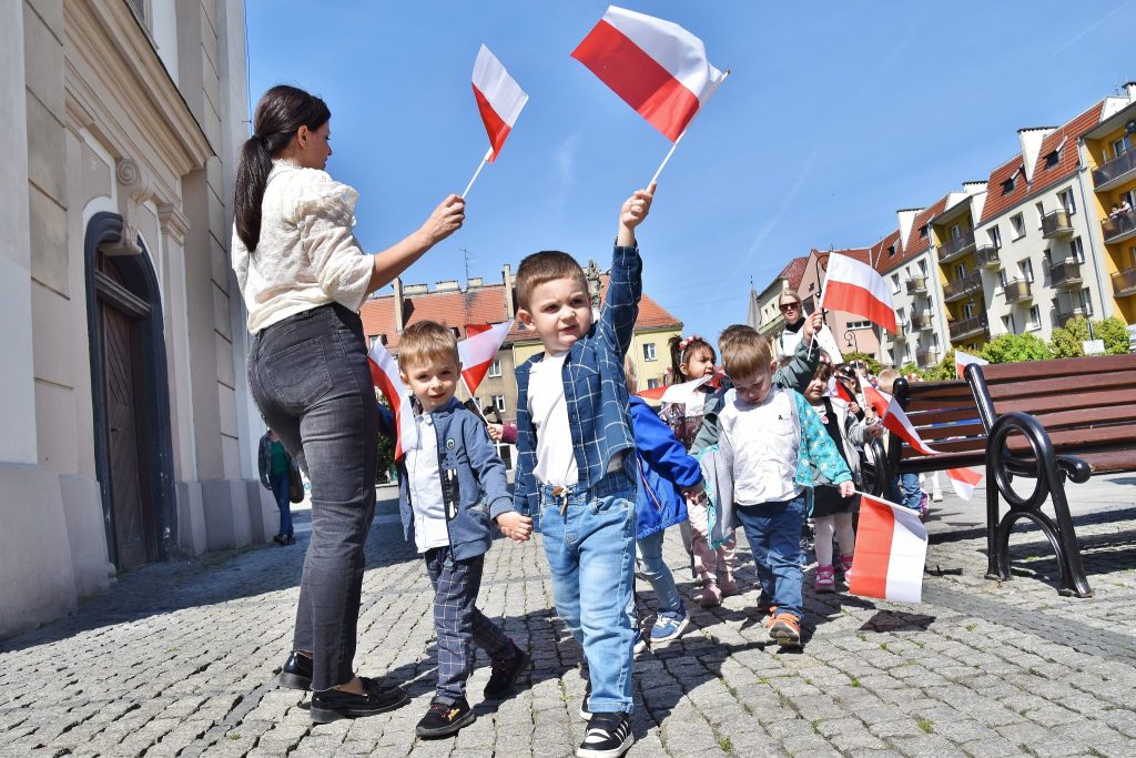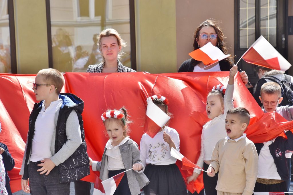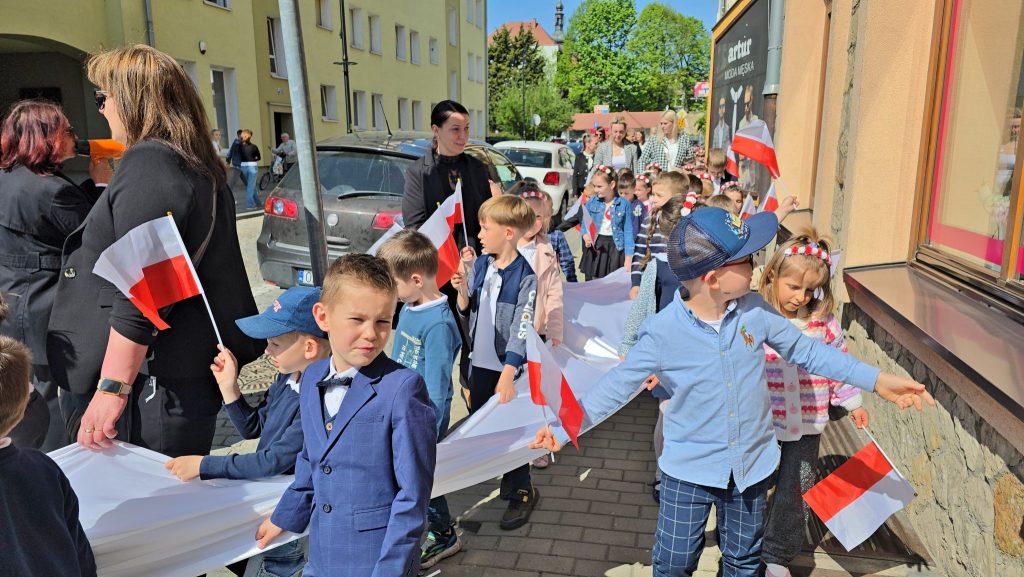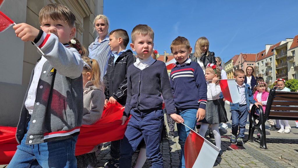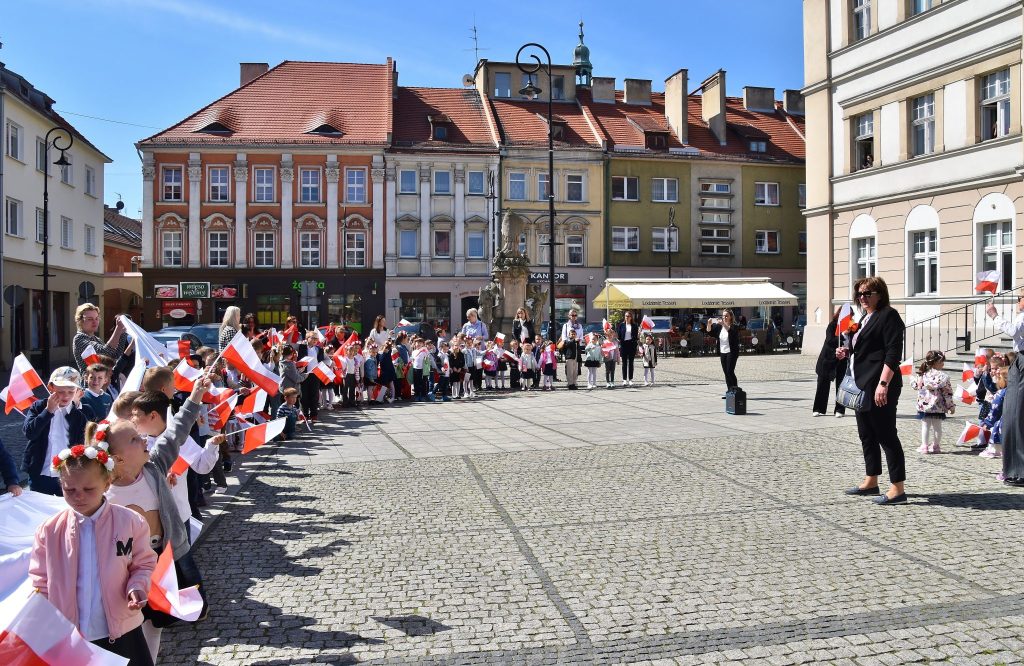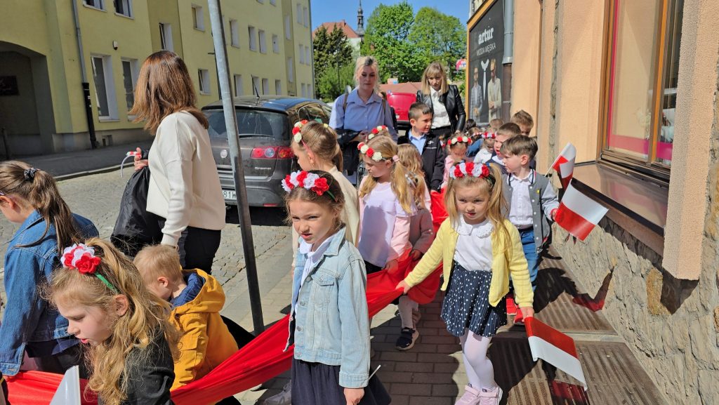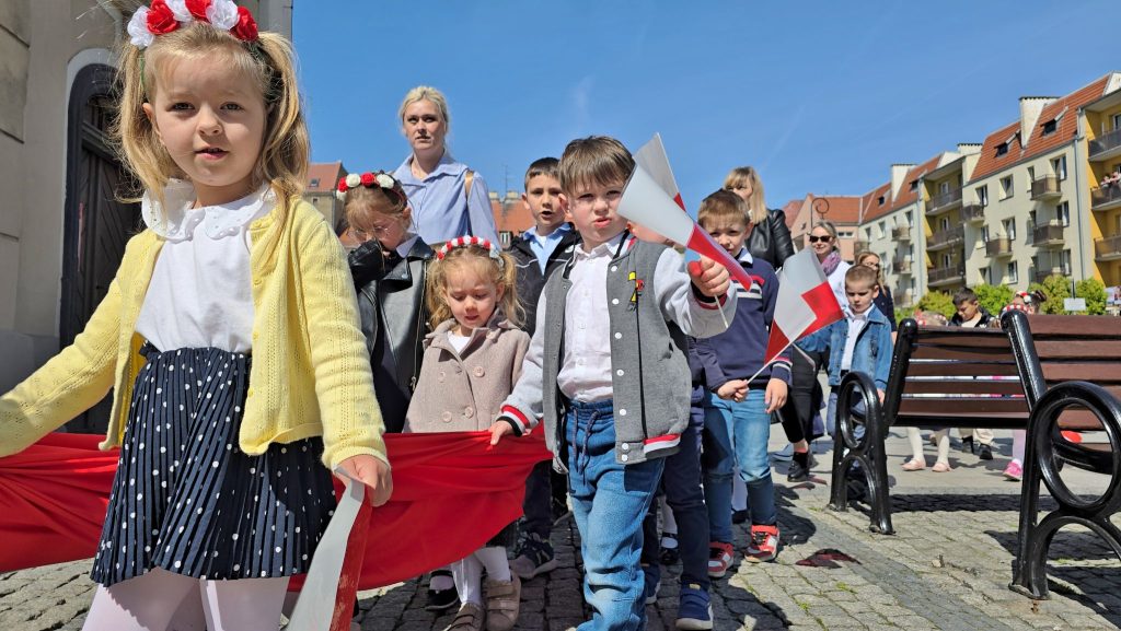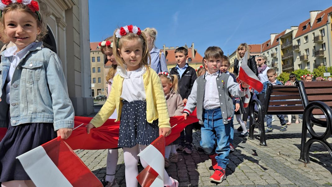Jeszcze przed początkiem długiej majówki dzieci z nauczycielkami Publicznego Przedszkola nr 7 w Prudniku obchodziły Święto Flagi Polski. Najmłodsi ze śpiewem na ustach przemaszerowali na rynek, gdzie zaśpiewali hymn Polski oraz prezentowali wielką, 10-metrową flagę narodową.