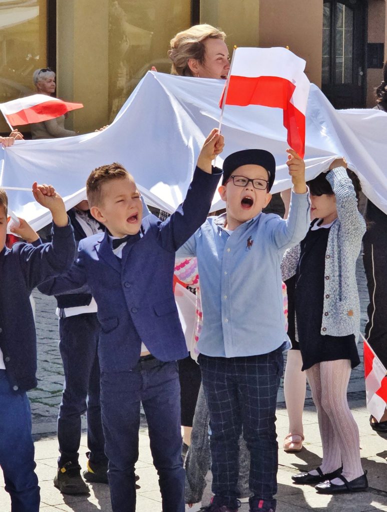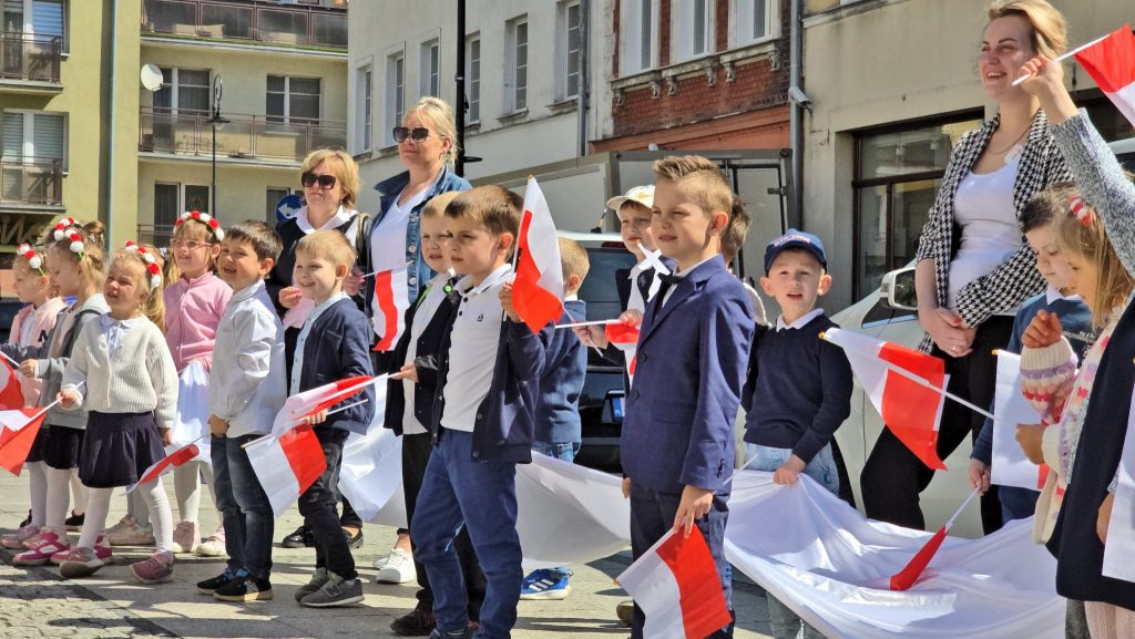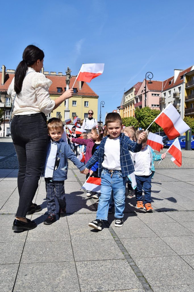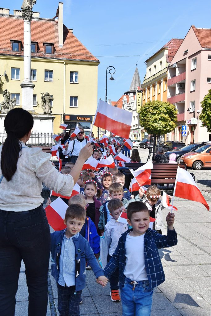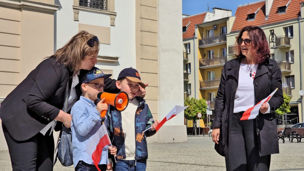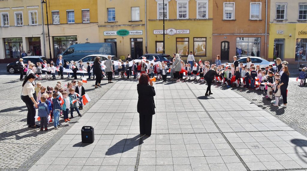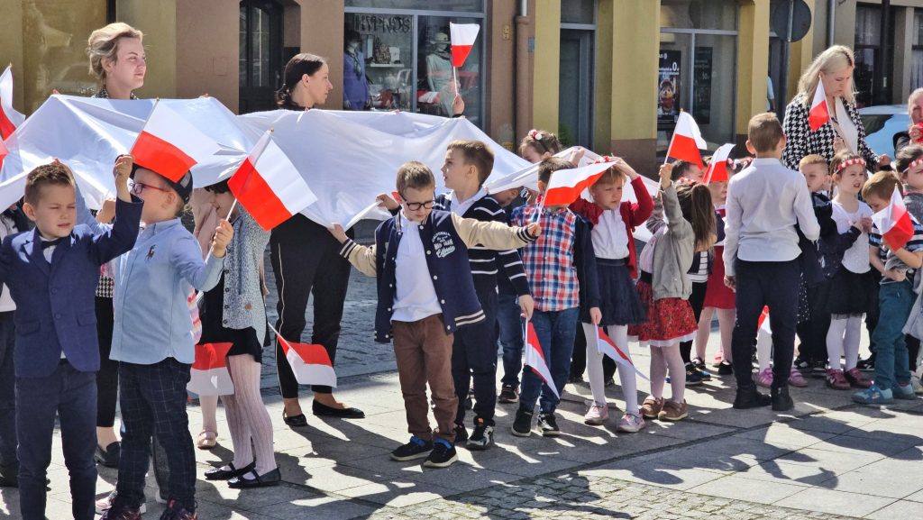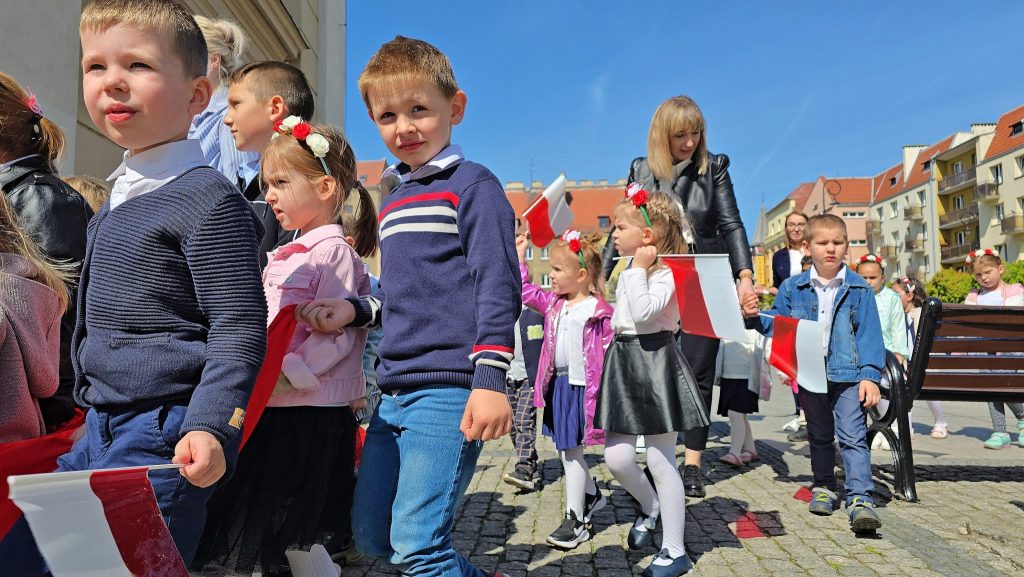 Jeszcze przed początkiem długiej majówki dzieci z nauczycielkami Publicznego Przedszkola nr 7 w Prudniku obchodziły Święto Flagi Polski. Najmłodsi ze śpiewem na ustach przemaszerowali na rynek, gdzie zaśpiewali hymn Polski oraz prezentowali wielką, 10-metrową flagę narodową.