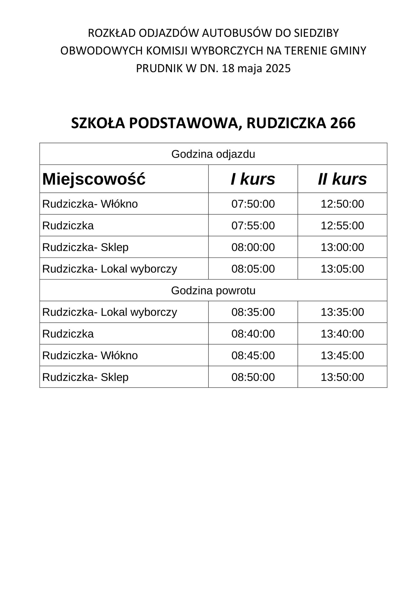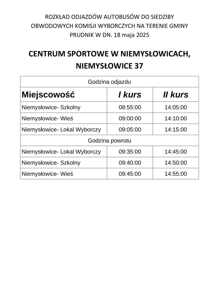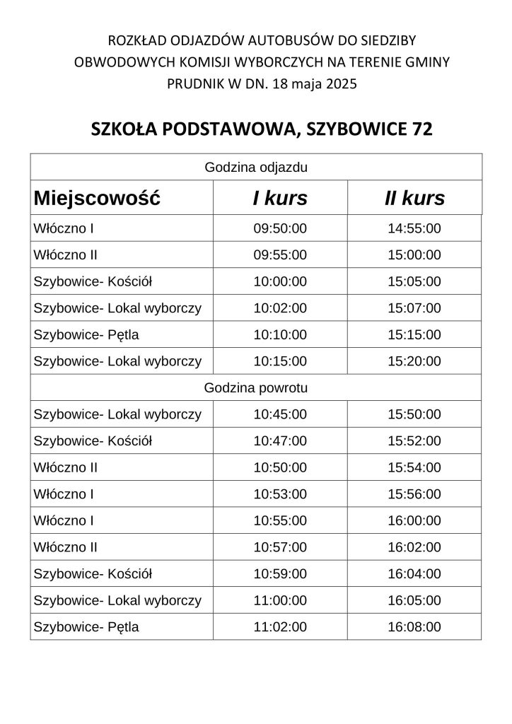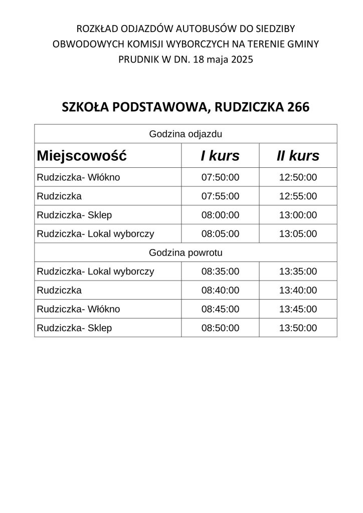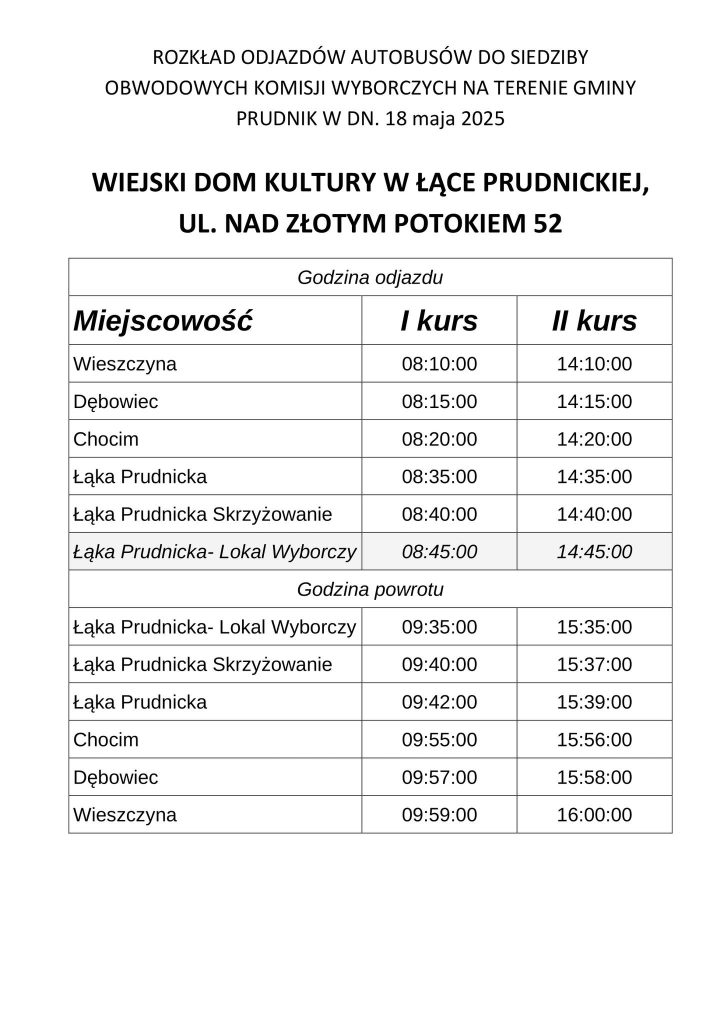 18 maja w dniu wyborów prezydenckich we wszystkich sołectwach gminy Prudnik zapewniony zostanie bezpłatny transport do lokali wyborczych. Poniżej rozkład jazdy dla poszczególnych sołectw.