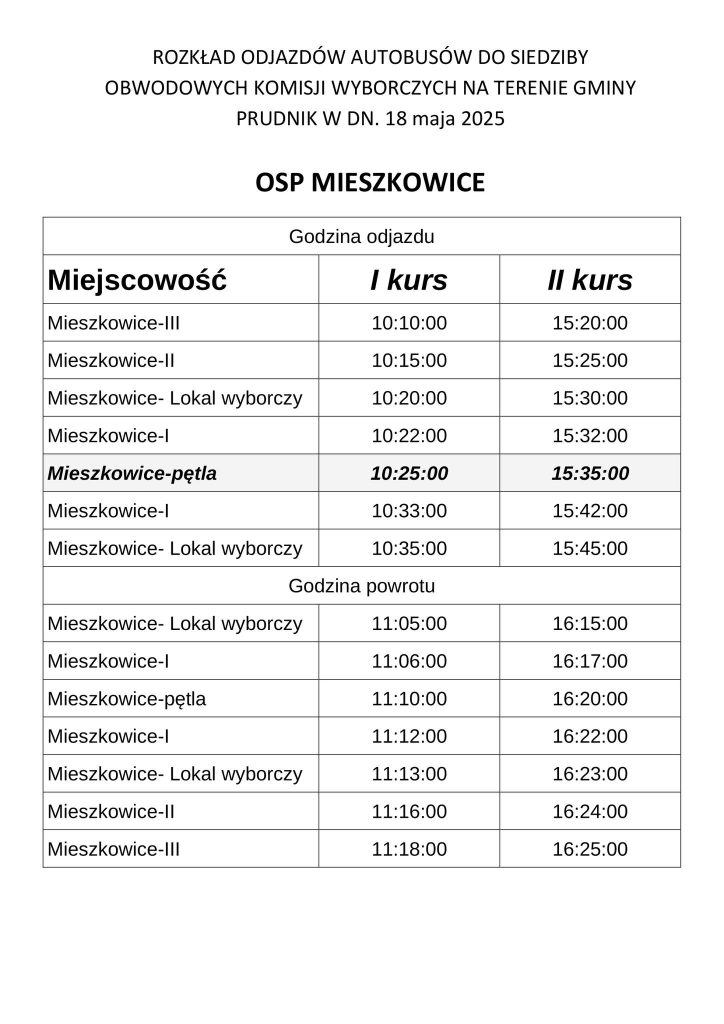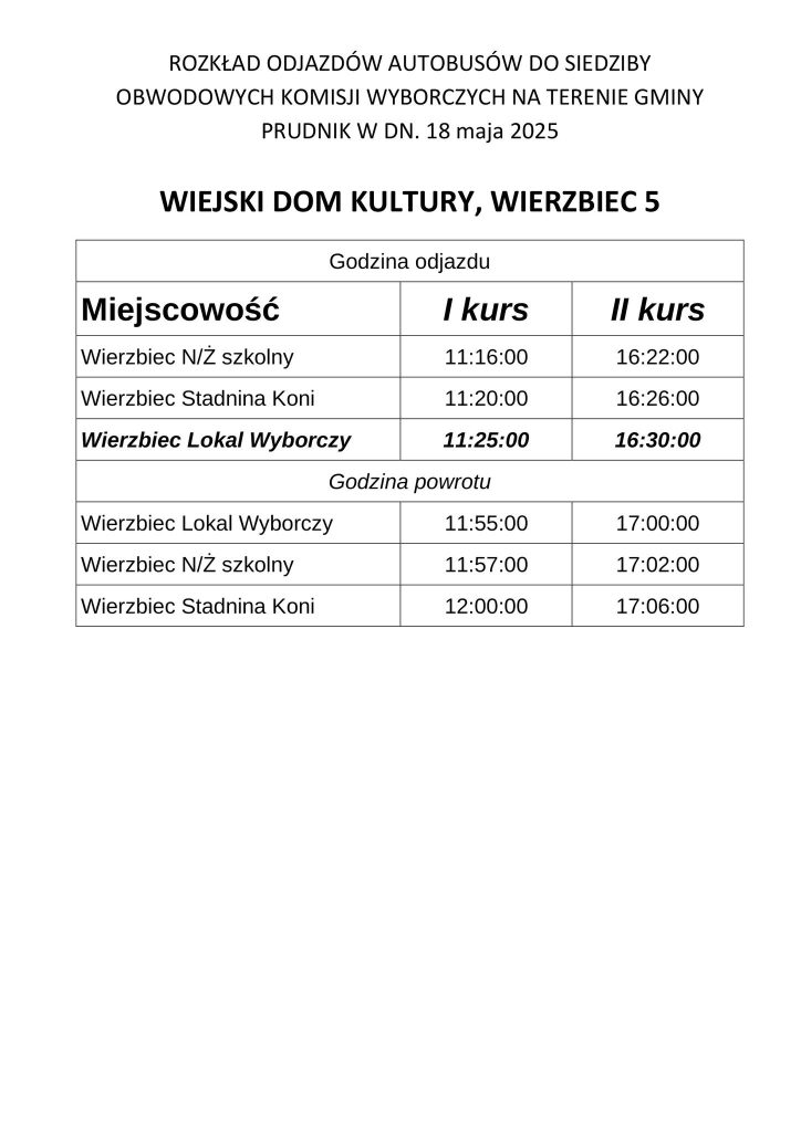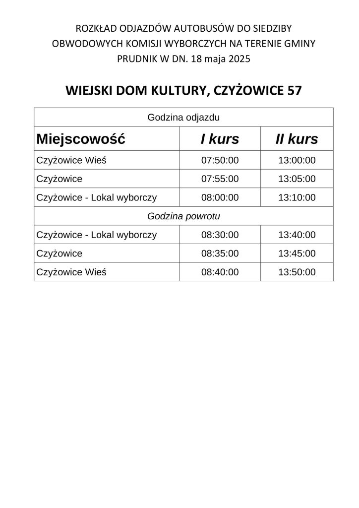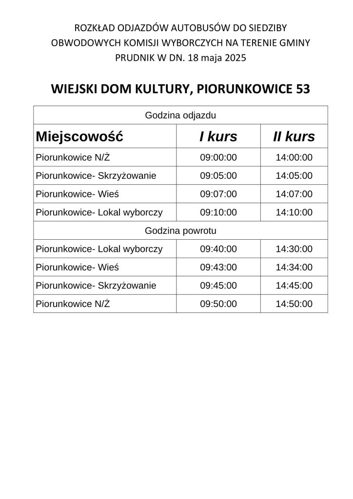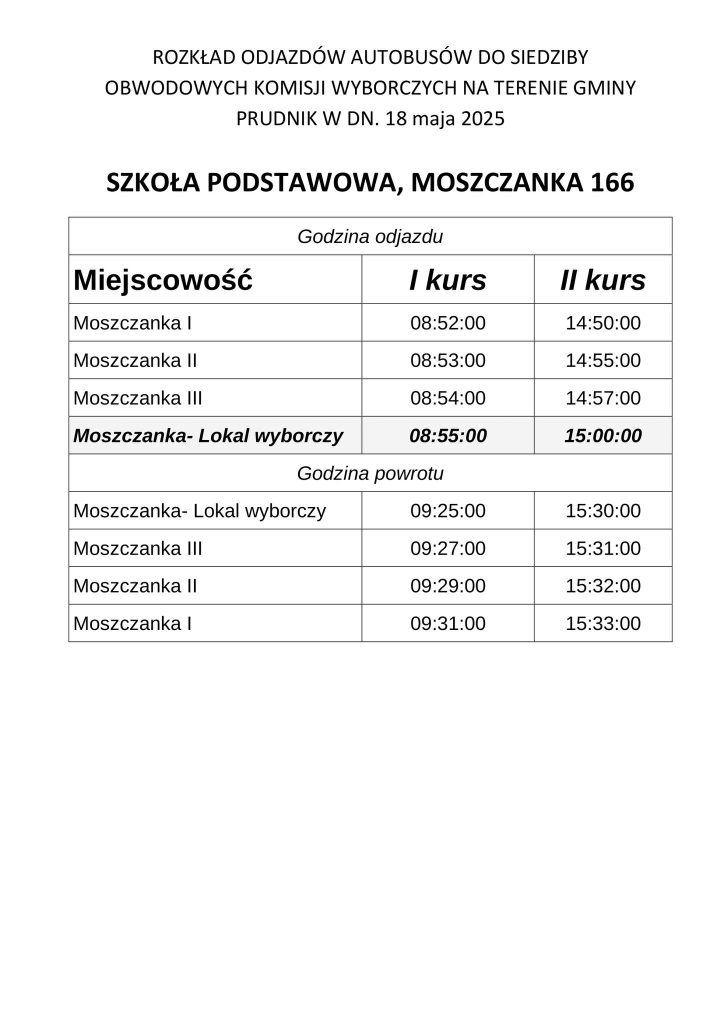 18 maja w dniu wyborów prezydenckich we wszystkich sołectwach gminy Prudnik zapewniony zostanie bezpłatny transport do lokali wyborczych. Poniżej rozkład jazdy dla poszczególnych sołectw.