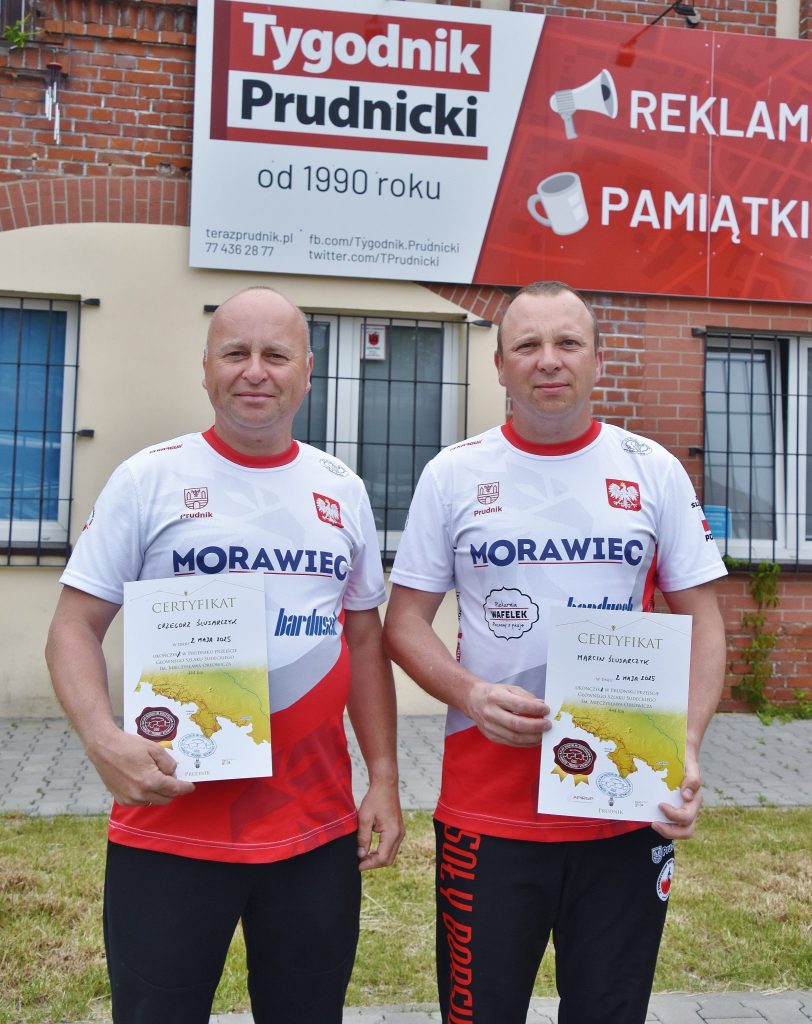 Swoją wyprawę z zachodu (Świeradów-Zdrój) na wschód (Prudnik) rozpoczęli w czwórkę – wspólnie z Karoliną i Andrzejem (z tej samej familii), ale ci ostatni, po 121 km marszu w trudnych warunkach (deszcz, mżawka, mgła), podjęli mądrą, choć trudną decyzję, o zaprzestaniu dalszej wędrówki. Od tej chwili bracia Marcin i Grzegorz wędrowali w dwójkę. 2 maja, po 10. dniach marszu (średnio 40-45 km dziennie!!!), zameldowali się przy szlakowej „kropce” na dworcu kolejowym w Prudniku. Jak przyznają, była to dla nich wspaniała przygoda, ale i doskonały trening, bo obaj uprawiają sportowy nordic walking.