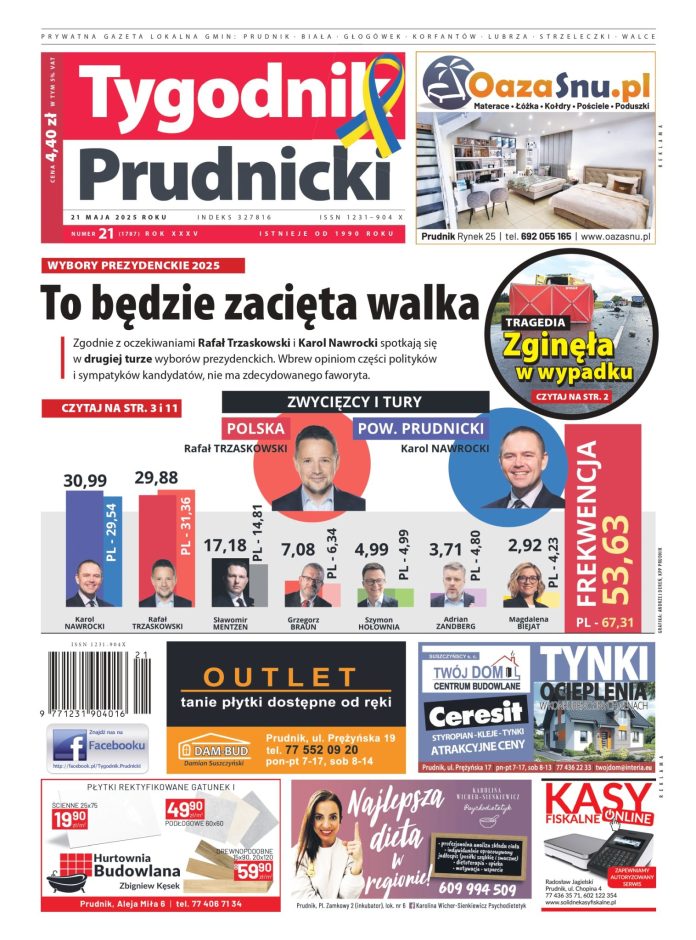 To będzie zacięta walka. Zgodnie z oczekiwaniami Rafał Trzaskowski i Karol Nawrocki spotkają się w drugiej turze wyborów prezydenckich. Wbrew opiniom części polityków i sympatyków kandydatów, nie ma zdecydowanego faworyta. Oto, o czym można przeczytać w nowym wydaniu „Tygodnika Prudnickiego” (21 maja):