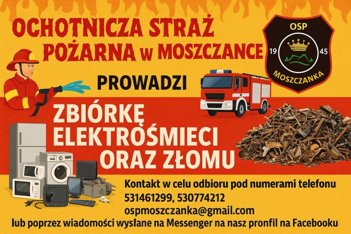 – Masz w domu niepotrzebny sprzęt elektryczny, elektroniczny lub złom? Nie wyrzucaj! Przekaż go nam i wspomóż działalność naszej jednostki! – zachęcają strażacy. Materiał odbierany jest bezpośrednio od mieszkańców. Kontakt telefoniczny: 531 461 299, 530 774 212, mailowy – ospmoszczanka@gmail.com lub przez profil Facebooka OSP Moszczanka.