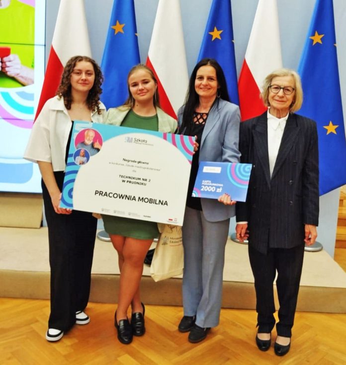 W ramach inicjatywy nauczycielki placówki: Agnieszka Sejnowska i Anna Paluszek-Dancewicz zorganizowały trzydniowe warsztaty, mające na celu rozwijanie kompetencji cyfrowych seniorów oraz wzmacnianie integracji międzypokoleniowej. Udział w nich wzięło 15 zaproszonych seniorów oraz 18 uczniów Technikum nr 2 w Prudniku. Zajęcia obejmowały szeroki zakres zagadnień, od podstaw obsługi urządzeń cyfrowych, przez korzystanie z mediów społecznościowych, po zaawansowane tematy związane z cyberbezpieczeństwem. Szczególny nacisk położono na uświadamianie uczestnikom zagrożeń związanych z oszustwami internetowymi, takimi jak phishing czy metoda „na wnuczka”. 29 kwietnia br., w Kancelarii Prezesa Rady Ministrów odbyła się uroczysta gala finałowa projektu „Szkoła Międzypokoleniowa”, podczas której Technikum nr 2 zostało nagrodzone, jako jedna z czterech najlepszych szkół w województwie. Placówka otrzymała mobilną pracownię komputerową, składającą się z 15 laptopów, monitor interaktywny oraz kartę podarunkową, w kwocie 2000 zł na sprzęt elektroniczny.