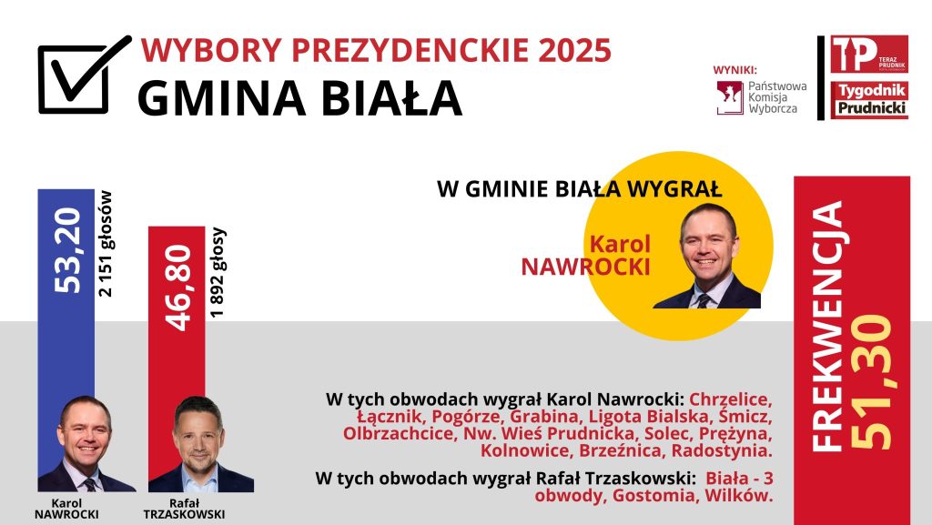 Tak też było w pierwszej turze wyborów, gdzie to właśnie Trzaskowski był liderem. Nawrocki wygrał w zdecydowanej części obwodów. Wyjątkiem była Biała, która pozostała wierna Trzaskowskiemu oraz obwody w Gostomi i Wilkowie. W gminie Biała odnotowano najniższą, gminną frekwencję w powiecie prudnickim – 51,30 proc.