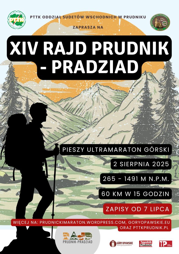 Ultramaraton górski Rajd Prudnik – Pradziad odbędzie się 2 sierpnia (sobota). Impreza prudnickiego Oddziału PTTK odbywa się już po raz 14., zdobywając niemałe grono miłośników. Uczestnicy startują nad ranem z Prudnika, by do godziny 20.00 dotrzeć na szczyt najwyższej góry Sudetów Wschodnich – Pradziada. Różnica wysokości nad poziomem morza między Prudnikiem a Pradziadem to 1226 metrów (265 – 1491), jednak po drodze jest sporo wzniesień i gór. W tym roku suma podejść wyniesie aż 2857 m, a zejść 1645. To pokazuje jak wymagająca jest trasa.