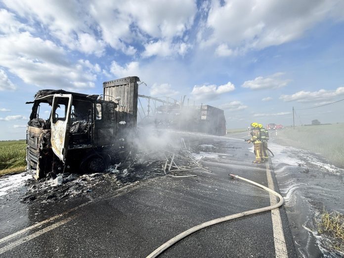 Sześć zastępów straży pożarnej brało udział w gaszeniu pożaru ciągnika siodłowego na DK 40 pomiędzy Wierzchem, a Mochowem