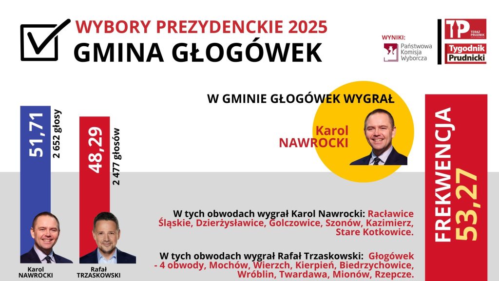 Ma to też odzwierciedlenie porównaniu liczby obwodów, gdzie wygrali kandydaci. Trzaskowski pokonał Nawrockiego w 12. obwodach, a Nawrocki Trzaskowskiego tylko w sześciu. Przeważyła znacząca przewaga Nawrockiego w głosach we wsiach niemniejszościowych i wyrównane wyniki w miejscowościach śląskich. W Głogówku, podobnie jak w Białej, górą był Trzaskowski (52,93 proc.). Głogówecka frekwencja była niska i wniosła 53,27 proc.