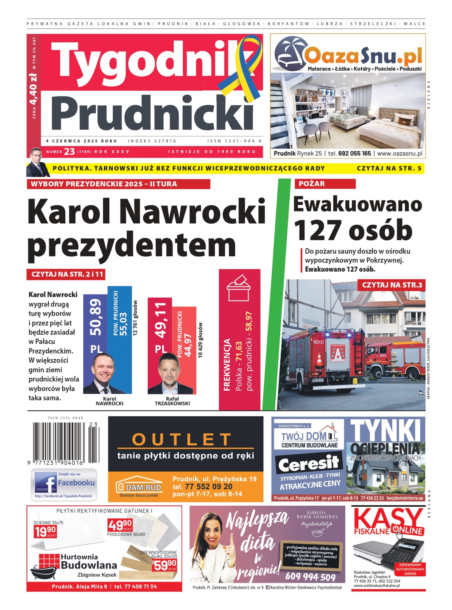 Karol Nawrocki prezydentem. Karol Nawrocki wygrał drugą turę wyborów i przez pięć lat będzie zasiadał w Pałacu Prezydenckim. W większości gmin ziemi prudnickiej wola większości wyborców była taka sama. Oto, o czym można przeczytać w nowym wydaniu „Tygodnika Prudnickiego” (4 czerwca):
