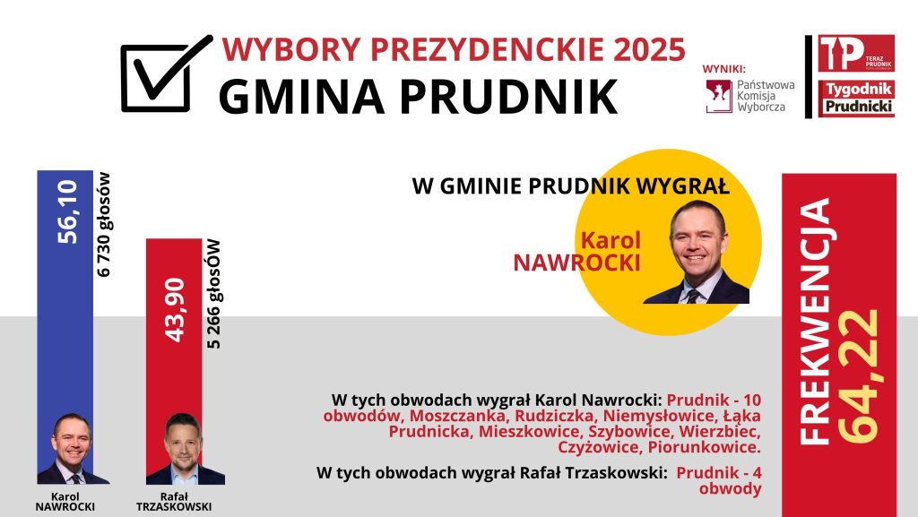 Tym samym mieszkańcy gminy potwierdzili swój wybór z pierwszej tury. Co więcej Nawrocki wygrał również w mieście (51,49 do 48,51), choć w pierwszej turze zwycięzcą był tam Rafał Trzaskowski. Kandydat PO wygrał tylko w czterech obwodach w Prudniku.