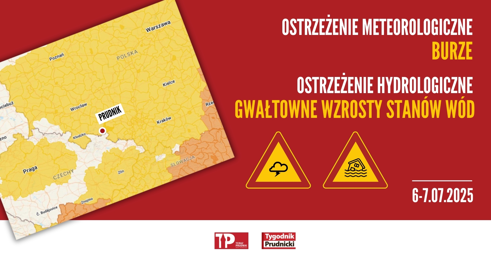 Instytutu Meteorologii i Gospodarki Wodnej wydał na Prudnika i okolic dwa ostrzeżenie. Pierwsze dotyczy burz: – Prognozowane są burze, którym miejscami będą towarzyszyć silne opady deszczu od 20 mm 35 mm oraz porywy wiatru do 75 km/h. Lokalnie grad.