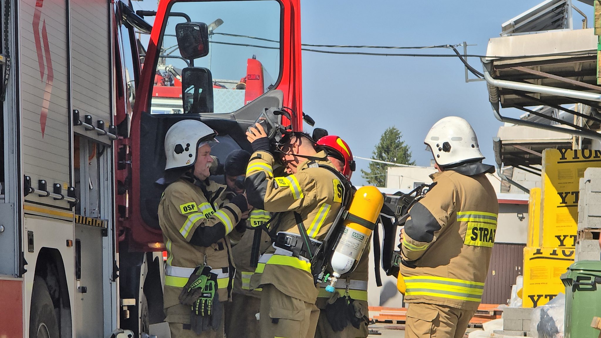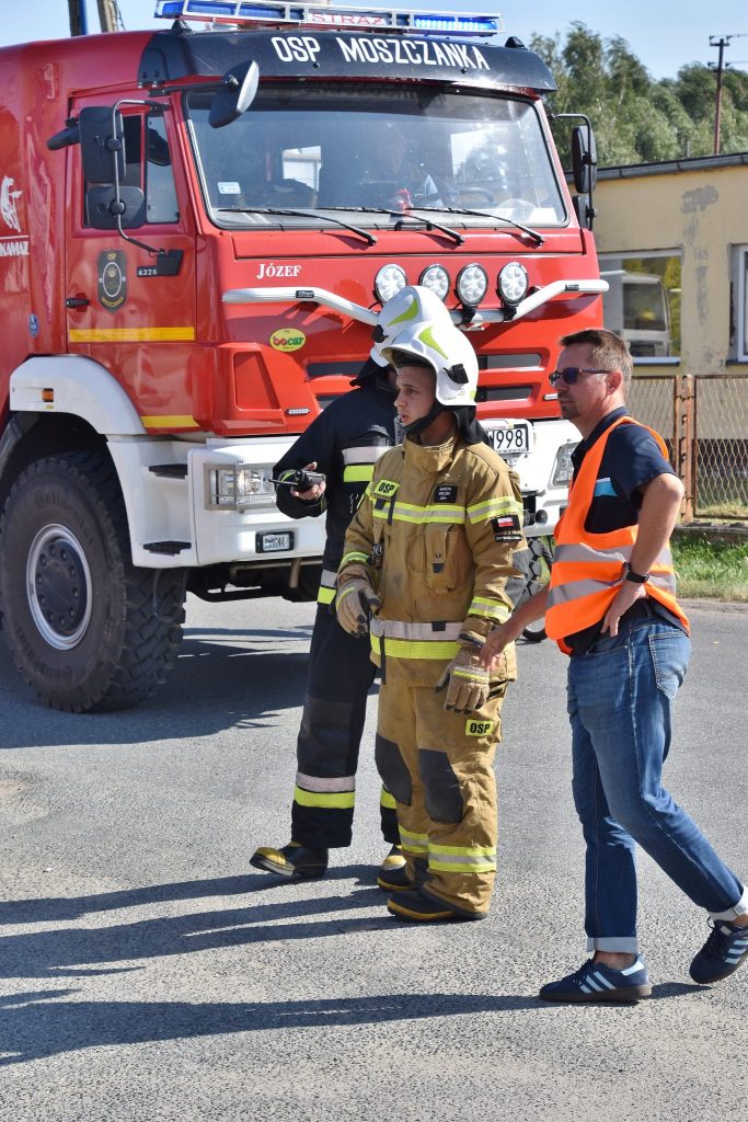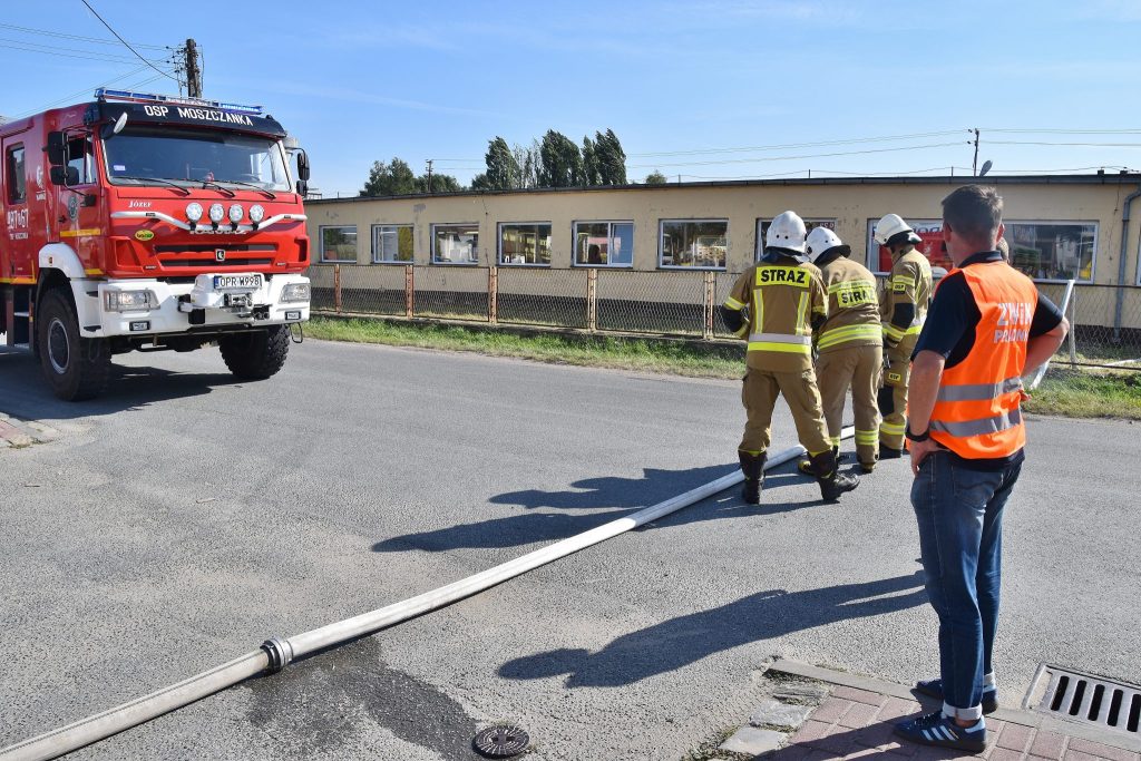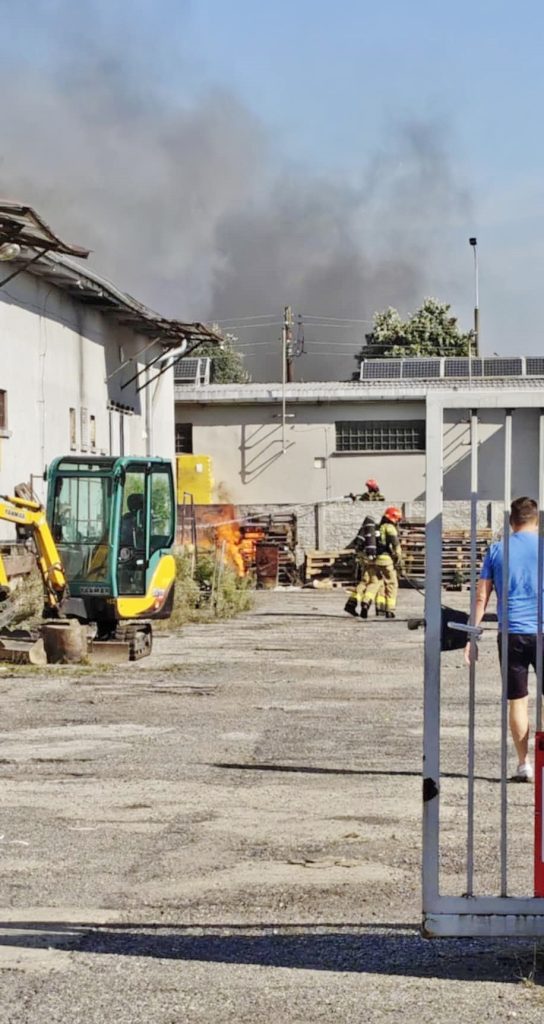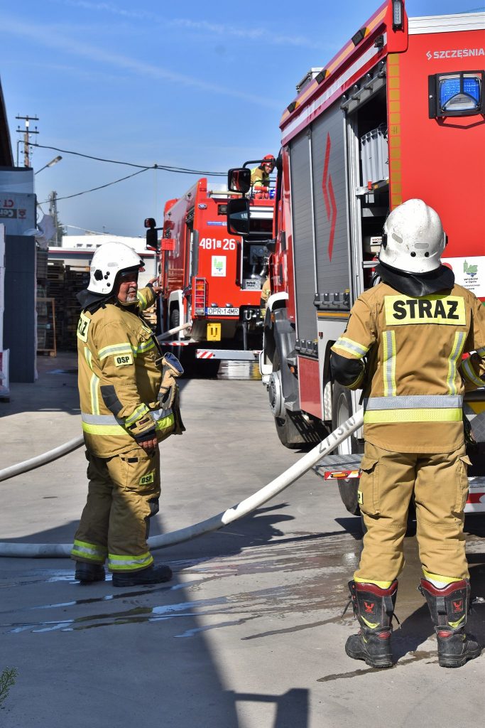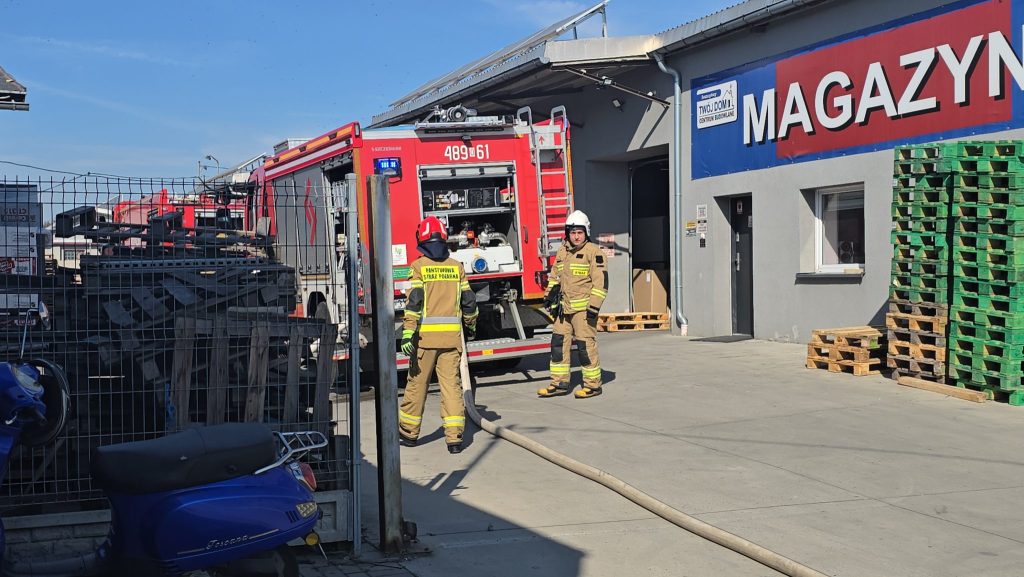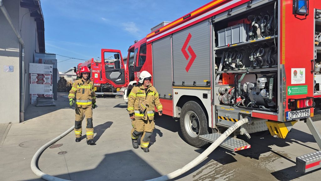 Na miejscu okazało się, że palą się stare przedmioty, w tym regały i opony, składowane między ścianą budynku magazynowego a ogrodzeniem posesji. Ogień nie wdarł się do pomieszczeń, ale ze względu na częściowe zadymienie strażacy używali sprzętu chroniącego drogi oddechowe. Strażaków wsparli pracownicy ZWiK Prudnik (woda z hydrantu). Na miejscu działali strażacy z JRG Prudnik oraz OSP Moszczanka, Łąka Prudnicka i Szybowice.