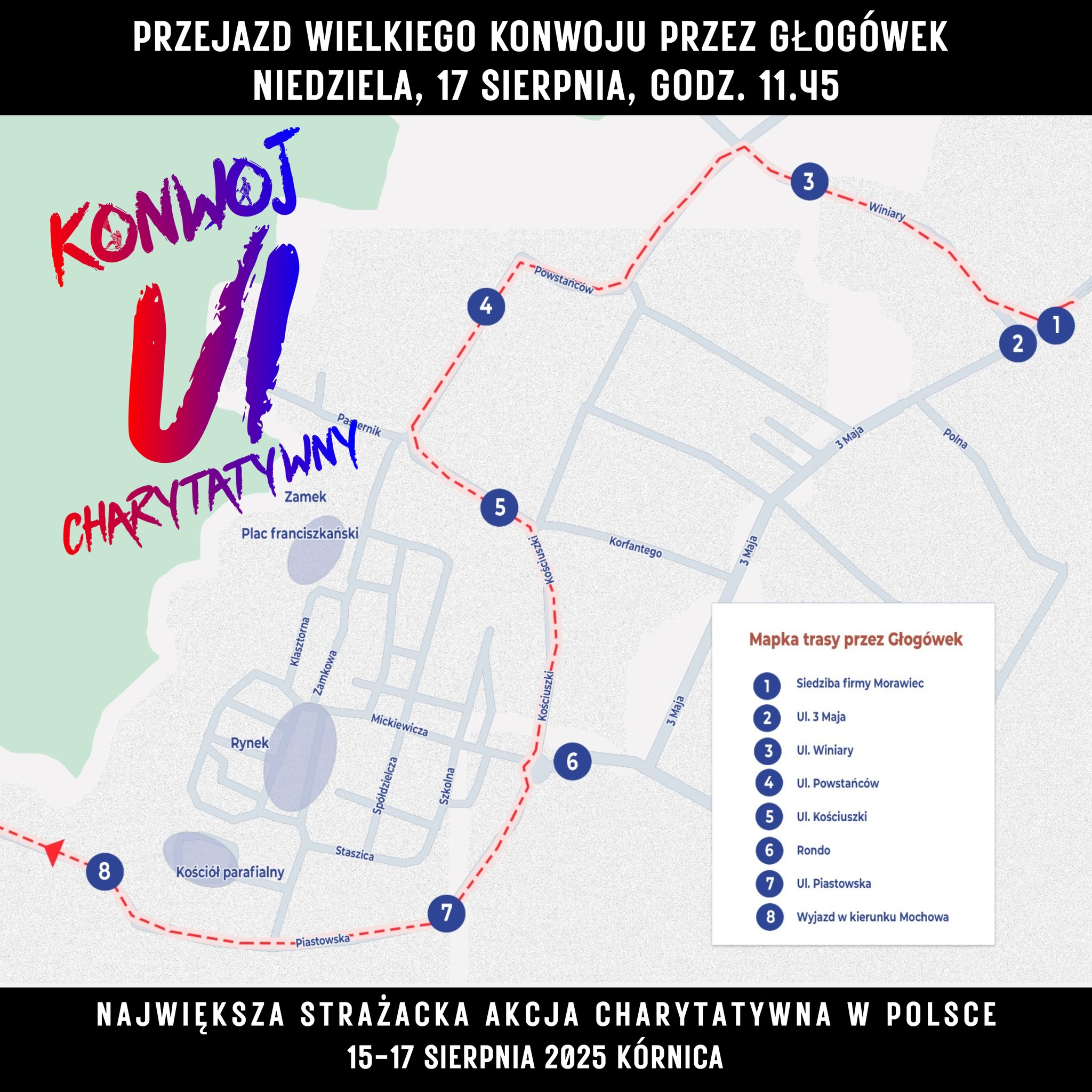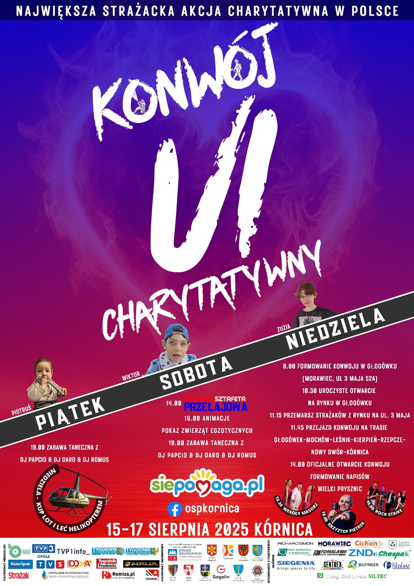 Impreza łączy w sobie walor pomocy potrzebującym oraz spektakularny pokaz sprzętu strażackiego – od zabytkowych pojazdów, po najnowsze wozy bojowe. Tegoroczny konwój odbędzie się 15-17 sierpnia, a celem prowadzonej zbiórki będzie wsparcie rodzin trojga dzieci: Piotrusia (1 rok) z Walec, malca z rdzeniowym zanikiem mięśni (SMA), któremu pilnie potrzebna jest kosztowna rehabilitacja; Wiktora (7 lat) z Racławic Śląskich (chłopiec z rzadkim zespołem Myhre, skazany na cykliczne, drogie turnusy rehabilitacyjne do końca życia) oraz Zuzi (17 lat) z Żyrowej (nastolatka z wtórną mitochondriopatią, bartonelozą, babesiozą i zakażeniem HHV-7, której codzienność to ból, problemy z poruszaniem i nauka w domu, a jedyną nadzieją są specjalistyczne badania i leczenie wymagające ogromnych nakładów finansowych).