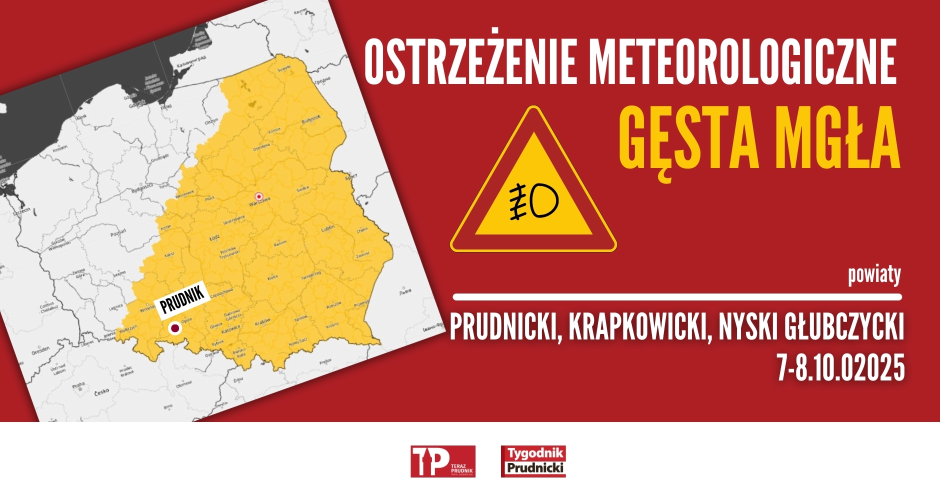 – Prognozuje się miejscami gęste mgły, w zasięgu których widzialność będzie wynosić poniżej 200 m – informują meteorolodzy. Ostrzeżenie dla powiatów: prudnickiego, krapkowickiego, nyskiego i głubczyckiego obowiązuje do wtorku, 7 października, od godz. 22.00 do środy, 8 października, do godz. 9.00.